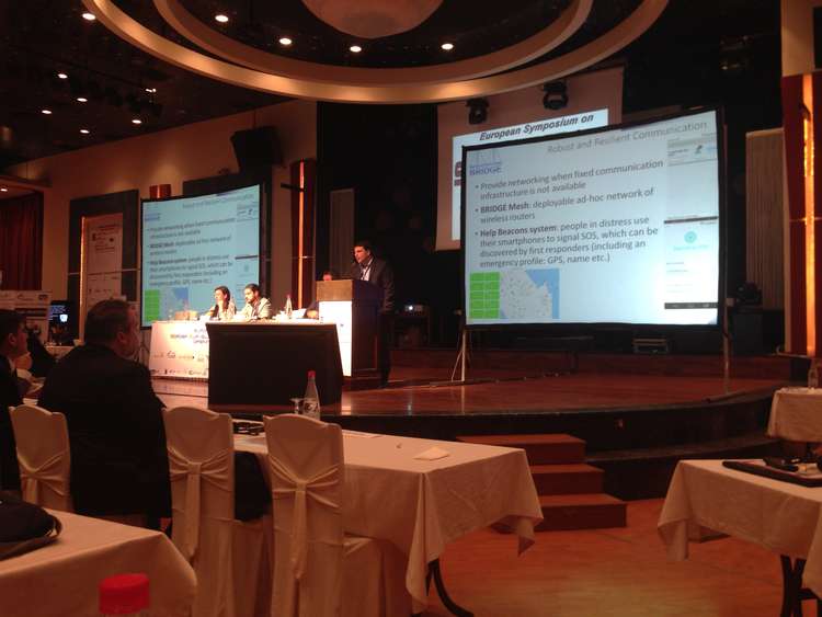 BRIDGE was presented through a plenary presentation and a BRIDGE booth. BRIDGE Technical Coordinator Evangelos Vlachogiannis (Fraunhofer FIT) gave a 20 minutes presentation focusing on the overall BRIDGE user-centered approach targeting to emergent interoperability (i.e., System of Systems). The presentation focused (a) on a subset of concept cases (Robust and Resilient Communication, Master, Dynamic Tagging/eTriage, and First Responder Integrated Training System (FRITS), (b) on Ethical, Legal and Social Issues (ELSI) as a critical dimension, and (c) on BRIDGE ValEDation approach and tangible results. The BRIDGErs - Monika Buscher (Lancaster University), Michelle Burghardt (Versuchstollen Hagerbach), René Reiners (Fraunhofer FIT), Morten Wenstad (Crisis Training), Max Wietek (Versuchstollen Hagerbach) and Antoine Pultier (SINTEF) - had the opportunity to demonstrate the aforementioned concept cases in the BRIDGE booth, discuss them with interested participants, share experiences, mostly through BRIDGE videos, and consider potential future opportunities in the field.