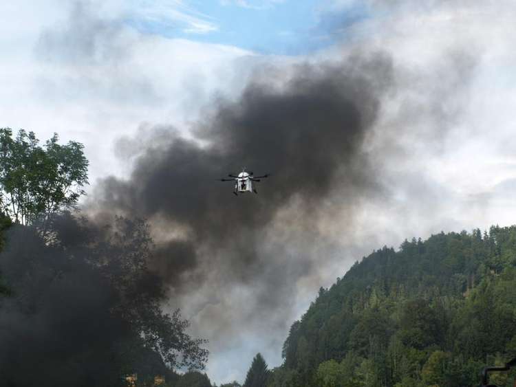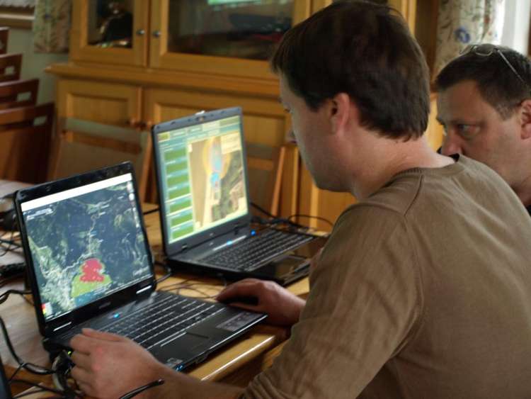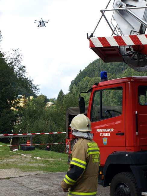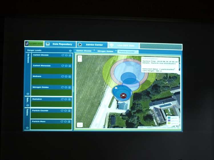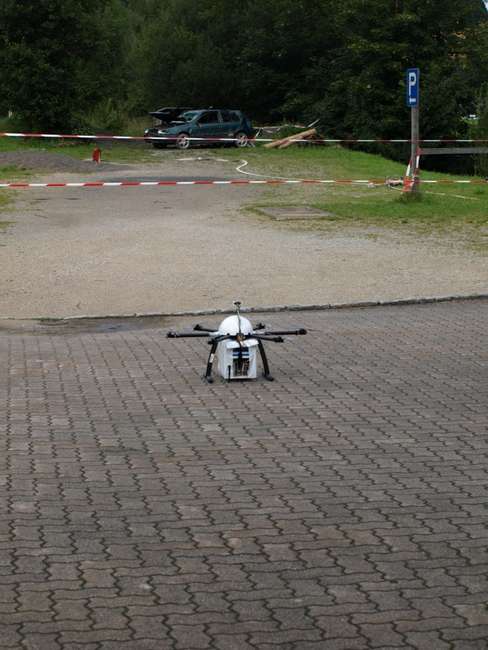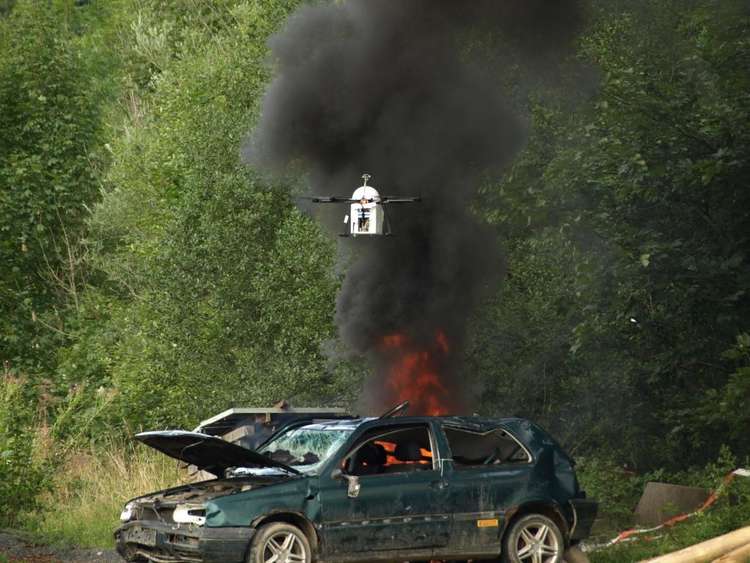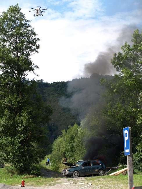 The exercise in St. Gilgen was based on a hypothetical car accident with four victims lying in the surrounding meadows. It started with a car fire, which was filmed and analyzed by the flying hexacopter. Subsequently, the exploding petrol tank of the vehicle was simulated using pyrotechnics. VIS- and IR information clearly indicated the location of all victims. Together with the environmental sensor data (carbon monoxide, carbon dioxide, nitrogen oxide, particle mass and -size), this information was the basis for the Expert System and the Modelling Module to provide advice to the Incident Commander.